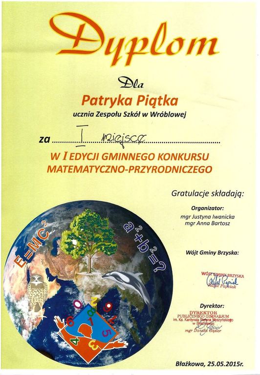Uczeń klasy II gimnazjum Patryk Piątek zwyciężył w I Gminnym Konkursie Matematyczno - Przyrodniczym, który odbył się 25.05.2015 r. w Publicznym Gimnazjum w Błażkowej. Patryk uzyskał największą ilość punktów zarówno z matematyki jak i z geografii, wygrywając z 8 punktową przewagą nad drugą zawodniczką. Gratulujemy i życzymy mu kolejnych sukcesów. W konkursie brało udział