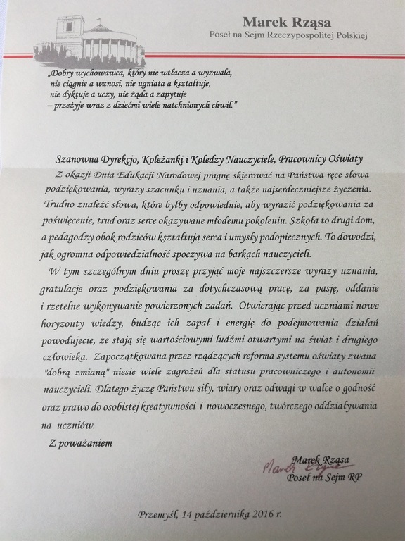 Taką osobą jest między innymi Pan Poseł Marek Rząsa, który z okazji Dnia Edukacji Narodowej przesłał nam życzenia.