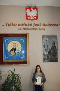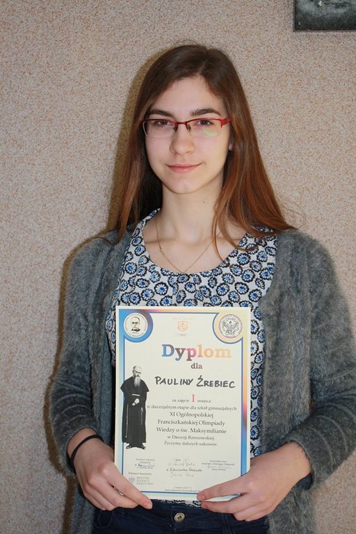 Paulina zajęła I miejsce w diecezjalnym etapie XI Ogólnopolskiej Franciszkańskiej Olimpiady Wiedzy o św. Maksymilianie w Diecezji Rzeszowskiej. Święty Maksymilian Kolbe jest patronem naszej placówki, co zobowiązuje całą społeczność szkolną do pielęgnowania reprezentowanego przezeń systemu wartości, ale także do poszerzania wiedzy o tym wielkim Polaku. Paulina z obu tych zadań wywiązała się perfekcyjnie. Etap ogólnopolski olimpiady odbędzie się w Siedlcach.