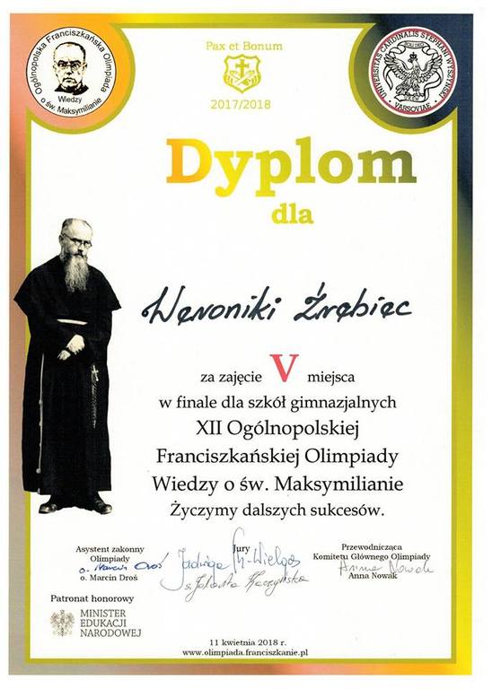 Przebieg olimpiady w Siedlcach był bardzo emocjonujący, bowiem po części pisemnej Weronika miała I miejsce, ostatecznie jednak zajęła V miejsce, zaś Karolina – VII.