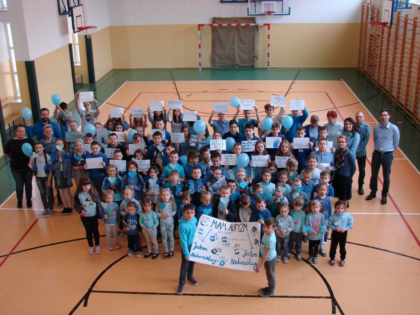 Na wspólnych zdjęciach uczniowie klas 4-8 prezentują kartki, na których wcześniej zapisali wybrane objawy autyzmu. Są one skrajnie odmienne, w zależności od tego, czy osoba z tym zaburzeniem jest nadwrażliwa czy niedowrażliwa, a same objawy różnią się nasileniem.