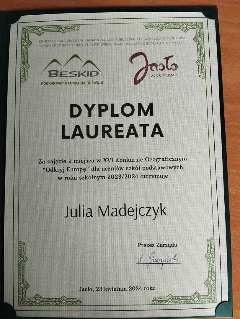 https://www.facebook.com/PodkarpackaFundacjaRozwojuBeskid. Do konkursu przystąpiło 89 uczniów z 19 szkół podstawowych z powiatu jasielskiego. Wyjątkową wiedzą wykazała się Julia Madejczyk z klasy 6, która zajęła II miejsce i uzyskała tytuł laureatki, zaś Emilia Szanduła z klasy 8 zajęła 8 miejsce i zdobyła tytuł finalistki.
